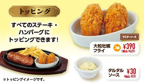 お好きなステーキやハンバーグにプラス390円(税込429円)で大粒 牡蠣フライ2個をトッピングとしてご注文いただけます。